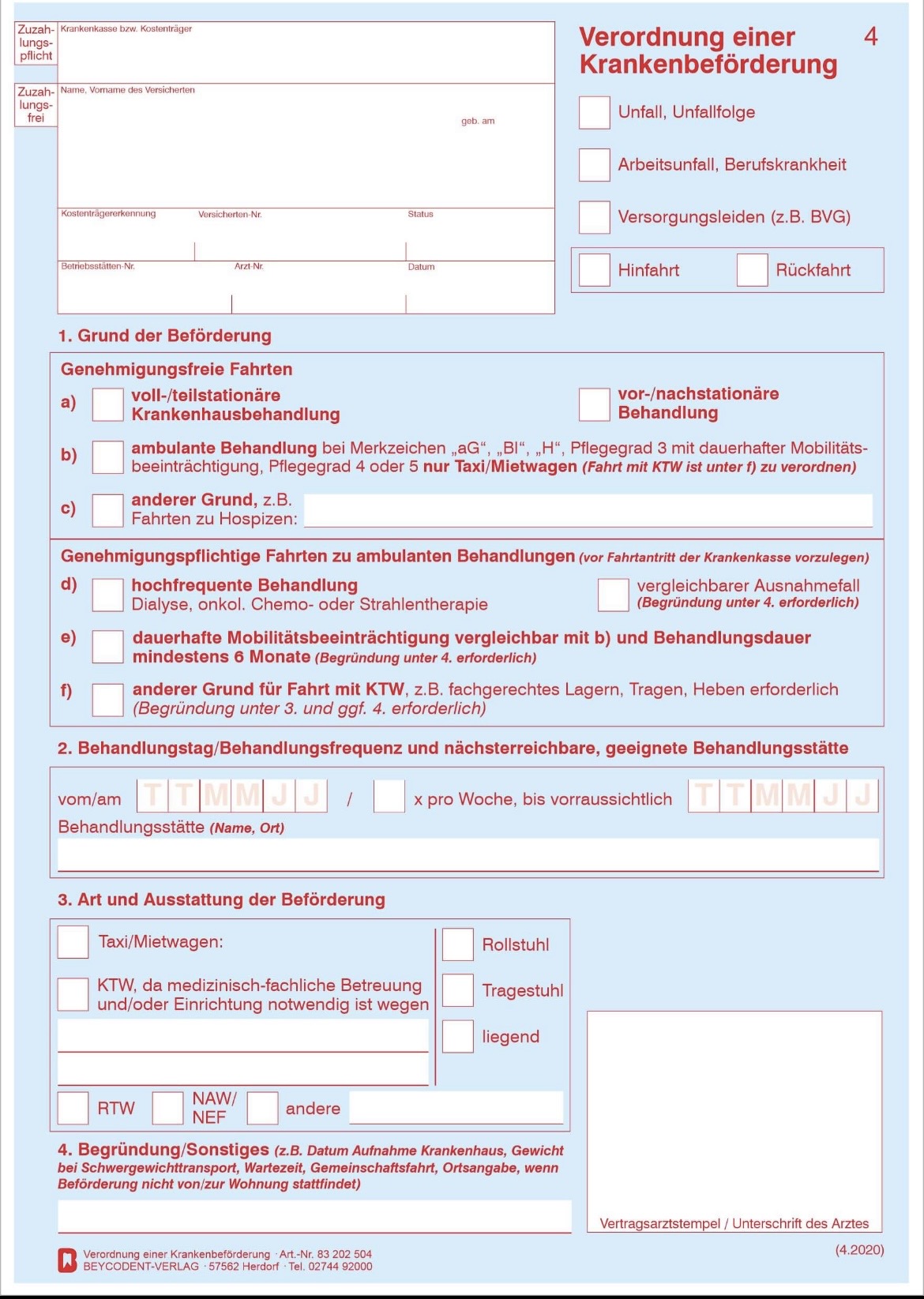 In vielen Fällen übernehmen die gesetzlichen oder privaten Krankenkassen die Kosten für medizinisch notwendige Fahrten. Dazu gehören bespielsweise Dialysefahrten, Chemotherapiefahrten, Bestrahlungsfahrten oder andere regelmäßige Behandlungen. Voraussetzung ist in der Regel eine Verordnung einer Krankenbeförderung vom behandelnden Arzt.