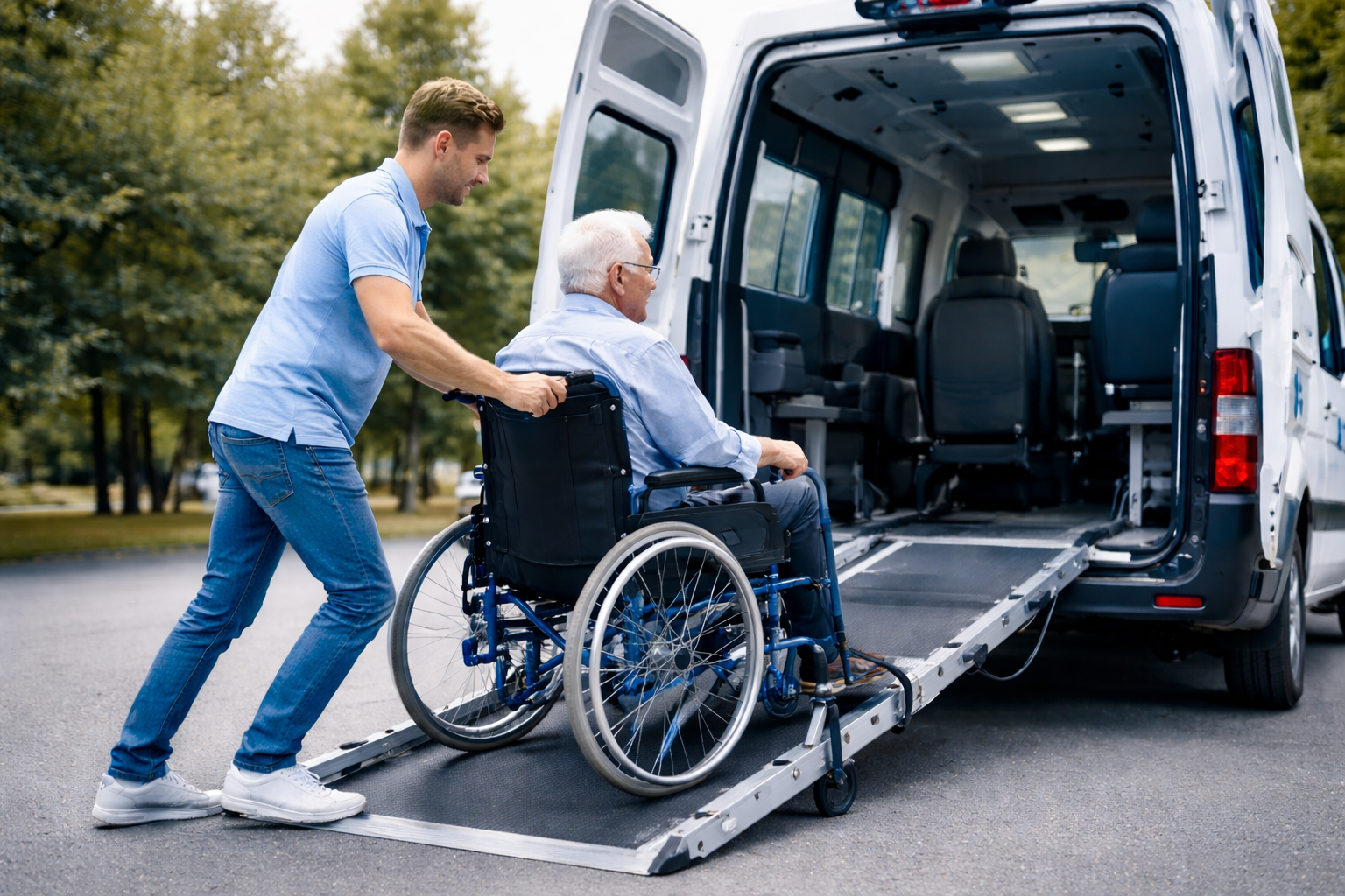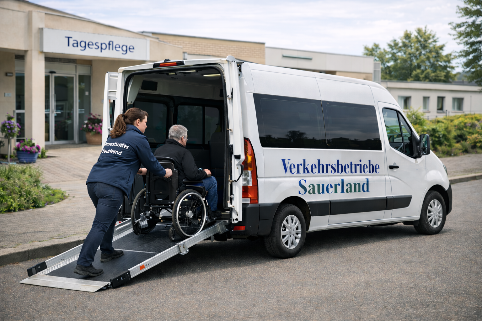 Für Fahrgäste mir eingeschränkter Mobilität bieten wir zusätzlich einen besonderen Service an. Unsere Fahrzeuge sind mit Rollstuhlrampe ausgestattet und wir verfügen über eigene Rollstühle sowie Tragestühle, um Patientinnen und Patienten bei Bedarf sicher zu transportieren und zu unterstützen.